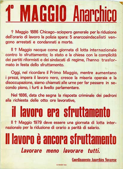 1° Maggio 1886 Chicago – sciopero generale per la riduzione dell’orario di lavoro la polizia spara: 5 anarcosindacalisti vengono arrestati e condannati a morte. Il 1° Maggio nacque come giornata di lotta internazionale contro lo sfruttamento; lo stato e la chiesa con la complicità dei partiti riformisti e dei sindacati di regime, l’hanno trasformato in festa dello sfruttamento