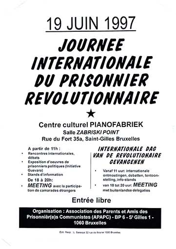 19 Juin 1997, Journee internationale du prisonnier revolutionnaire Centre culturel Pianofabriek Association des Parents et Amis des Prisonnier(e)s Communistes (APAPC) Bruxelles, 1997 numero: 4160dimensione: 42x30 cm Catalogo Manifesti, Internazionali, Lotta Armata - Carcere e Repressione, Movimento Antagonista