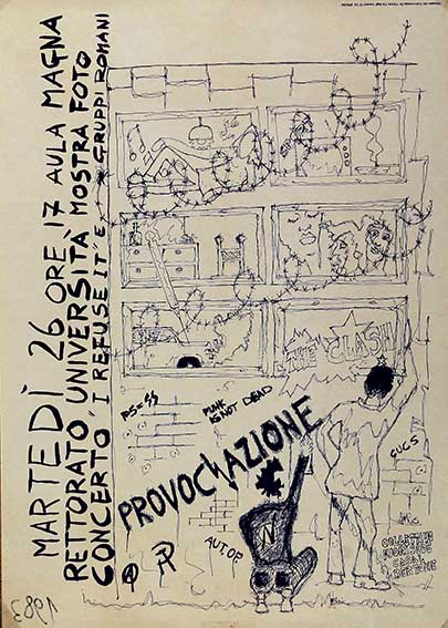 Concerto “I refuse it” e gruppi romani Rettorato università, mostra foto Provocazione Collettivo Fuorisede Casalbertone Roma, 1983 numero: 1507dimensione: 70x50 cm Catalogo Manifesti, Cultura Antagonista, Scuola, Università, Lotte studentesche