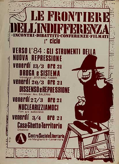 le frontiere dell’indifferenza Incontri, dibattiti, conferenze, filmati. I ciclo. Verso l’84: gli strumenti della nuova repressione … Centro sociale libertario numero: 0654dimensione: 88x60cm Catalogo Manifesti, CDA Anomalia, Cultura Antagonista, Movimento Anarchico, repressione centri sociali
