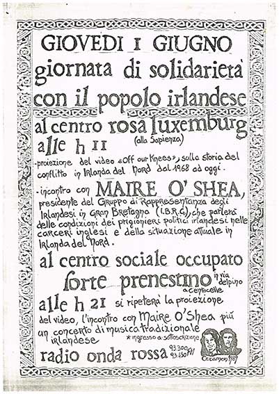 Giornata di solidarietà con il popolo irlandese Proiezione ed incontro … Centro Rosa Luxemburg, C.S.O. Forte Prenestino, Radio Onda Rossa Roma, 1989 numero: 4438dimensione: 42x30 cm Catalogo Manifesti, Centri sociali, laboratori e spazi occupati, Internazionali, Movimento Antagonista, Radio Onda Rossa