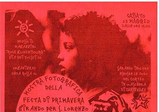 Mostra fotografica della festa di primavera girando per San Lorenzo Presso il magazzino “Rosa Luxemburg” … saranno inoltre esposte le foto del corteo in maschera di carnevale Onda Rossa 32 Roma, 1998 numero: 4122dimensione: 21x29 cm Catalogo Manifesti, Centri sociali, laboratori e spazi occupati, Cultura Antagonista, Radio Onda Rossa
