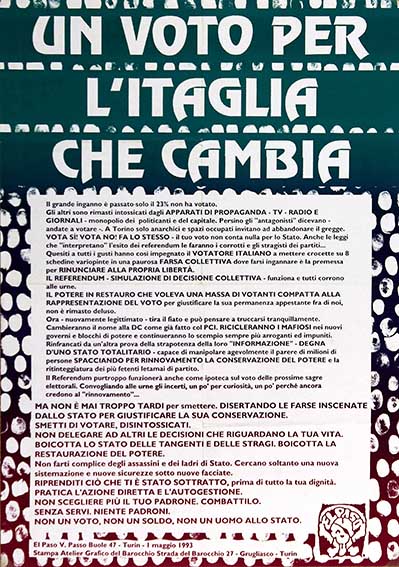 … disertando le farse inscenate dallo stato per giustificare la sua conservazione, smetti di votare, disintossicati