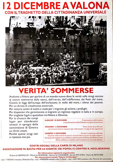 12 Dicembre a Valona … con il traghetto della cittadinanza universale Iniziative a favore dei profughi: 12 dicembre a Valona Centri Sociali della Carta di Milano, Associazione Ya Basta! Milano, 1998 numero: 0433 Catalogo Manifesti, Centri sociali, laboratori e spazi occupati