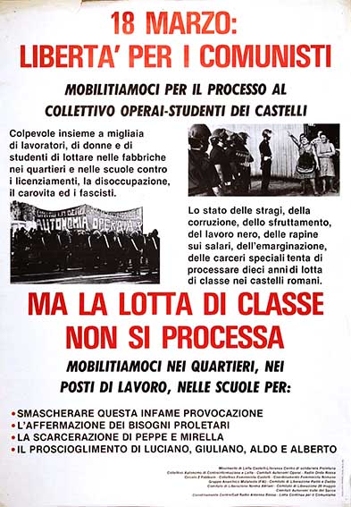 18 Marzo libertà per i comunisti Mobilitiamoci per il processo al Collettivo Operai-Studenti dei Castelli La lotta di classe non si processa Movimento di lotta Castelli … Viterco (Roma), 1981 numero: 0147dimensione: 100x70 Catalogo Manifesti, Lotta Armata - Carcere e Repressione, Movimento Antagonista