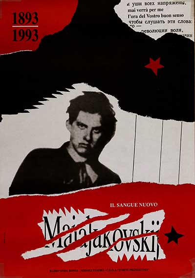 1893/1993 Maiajakovskij Il sangue nuovo Radio Onda Rossa, Nodali teatro, C.S.O.A. Forte Prenestino Roma, 1993 numero: 1634dimensione: 70x50 cm Catalogo Manifesti, Centri sociali, laboratori e spazi occupati, Cultura Antagonista, Radio Onda Rossa
