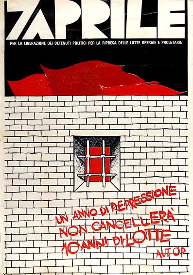 7 Aprile: liberazione detenuti politici Per la liberazione dei detenuti politici per la ripresa delle lotte operaie e proletarie Un anno di repressione non cancellerà 10 anni di lotte Autonomia operaia numero: 0515dimensione: 100x70 Catalogo Manifesti, Lotta Armata - Carcere e Repressione