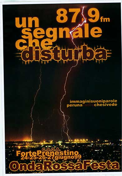 87.9 fm un segnale che disturba Immaginisuoniparole perunaradiochesivede OndaRossaFesta al C.S.O.A. Forte Prenestino Roma, 1999 numero: 6129dimensione: 100x70 cm Catalogo Manifesti, Radio Onda Rossa