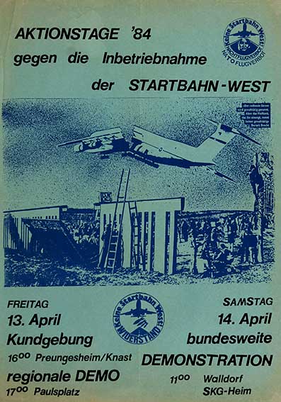 Aktion stage ’84 Gegen die inbetriebnahme der startbahn-west Demonstration 1984 numero: 2316dimensione: 61x43 cm Antimilitarismo, Catalogo Manifesti, Internazionali