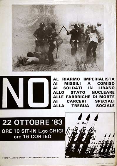 No al riarmo imperialista 22 Ottobre ’83, sit-in -corteo coord. nazionale Antimperialista Antinucleare 1983 numero: 0114dimensione: 100x70 Antimilitarismo, Catalogo Manifesti, Lotta Armata - Carcere e Repressione