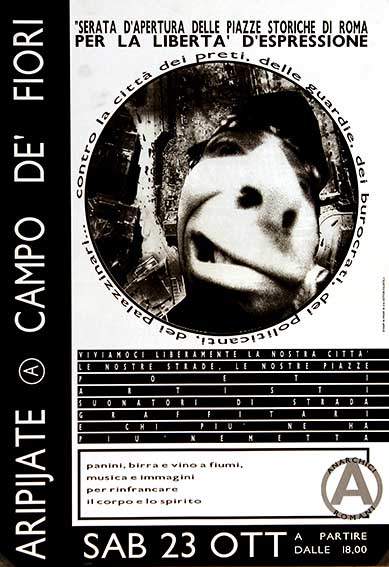 Aripijate Campo dè Fiori “Serata d’apertura delle piazze storiche di Roma per la libertà d’espressione Contro la città dei preti, delle guardie, dei burocrati, dei politicanti, dei palazzinari Anarchici Romani Roma, numero: 1095dimensione: 68x48 cm Catalogo Manifesti, Movimento Anarchico
