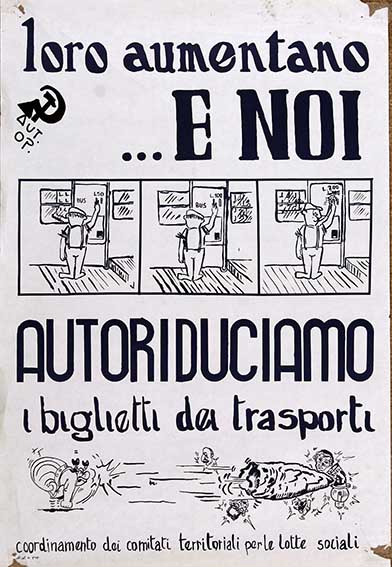 autoriduzione Loro aumentano … e noi autoriduciamo i biglietti dei trasporti. Coordinamento dei comitati territoriali per le lotte sociali Roma numero: 2017dimensione: 44x60cm Catalogo Manifesti, Lotte per la casa, Movimento Anarchico
