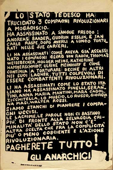 Lo stato tedesco ha trucidato 3 compagni rivoluzionari a Mogadiscio. Ha assassinato a freddo Andreas Baader, Gudrun Esslin e Jan Carle Raspe, dopo averli a lungo torturati nelle sue carceri