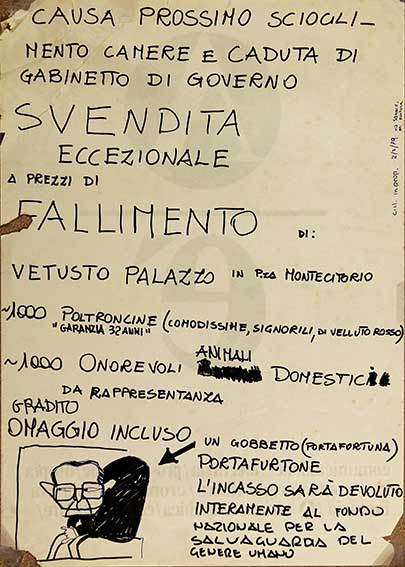 … svendita eccezionale a prezzi di fallimento di: vetusto palazzo in P.zza Montecitorio, 1000 poltroncine,1000 onorevoli animali domestici da rappresentanza …
