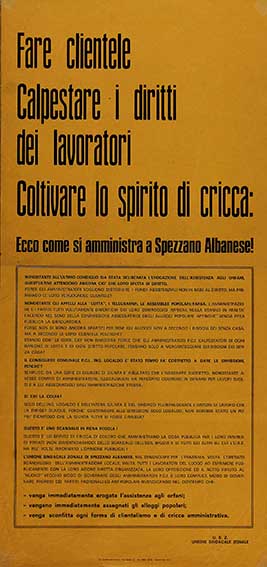 Ecco come si amministra a Spezzano Albanese Fare clientele, calpestare i diritti dei lavoratori, coltivare lo spirito di cricca U.S.Z. (Unione Sindacale Zonale) Spezzano Albanese numero: 2226dimensione: 70x33 cm Anarcosindacalismo, Catalogo Manifesti, Movimento Anarchico
