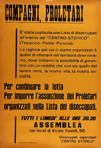 Per continuare la lotta, per imporre l’assunzione dei proletari organizzati nella Lista dei disoccupati, tutti i lunedì alle ore 20.30 assemblea nei locali di vicolo Savelli …