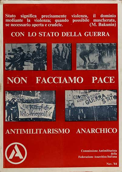 contro lo stato della guerra Stato significa precisamente violenza … (M. Bakunin) Con lo stato della guerra, non facciamo pace. Commissione antimilitarista della Federazione anarchica italiana Carrara, 1984 numero: 0726dimensione: 84x60cm Antimilitarismo, Catalogo Manifesti, Movimento Anarchico