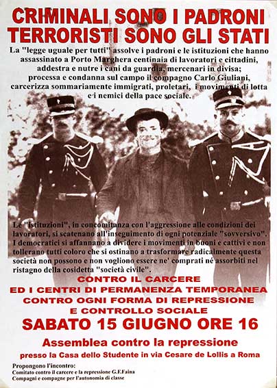 La “legge uguale per tutti” assolve i padroni e le istituzioni che hanno assassinato a Porto Marghera centinaia di lavoratori e cittadini, addestra e nutre i cani da guardia, mercenari in divisa; processa e condanna sul campo il compagno Carlo Giuliani, carcerizza sommariamente immigrati, proletari, i movimenti di lotta e i nemici della pace sociale