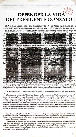 !Defender la vida del presidente Gonzalo! El Presidente Gonzalo naciò el 3 de diciembre de 1934 en Arequipa, la misma region donde naciò Josè Carlos Mariategui, fundador del Partido Comunista del Perù en 1928 … numero: 1321dimensione: 68x36 cm Catalogo Manifesti, Internazionali, Lotta Armata - Carcere e Repressione, Movimento Antagonista