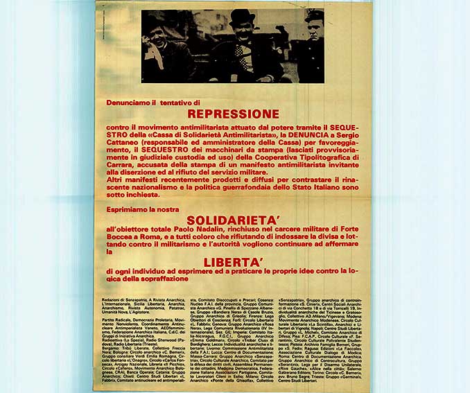 … attuato dal potere tramite il sequestro della “Cassa di Solidarietà Antimilitarista”, la denuncia a Sergio Cattaneo (responsabile ed amministratore della Cassa) per favoreggiamento, il sequestro dei macchinari da stampa …