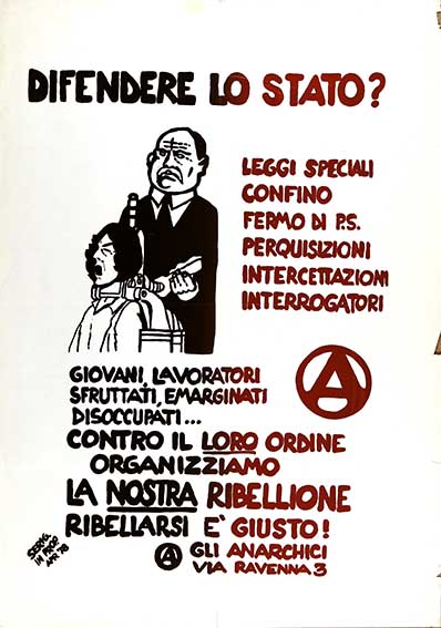 Difendere lo stato? Leggi speciali confino fermo di p.s. perquisizioni intercettazioni interrogatori … Contro il loro ordine organizziamo la nostra ribellione gli Anarchici Torino,1978 numero: 0483dimensione: 100x70 cm Catalogo Manifesti, Lotta Armata - Carcere e Repressione, Movimento Anarchico