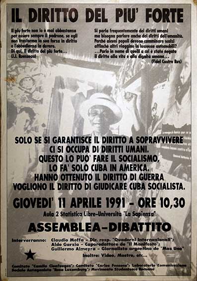 Il diritto del più forte Solo se si garantisce il diritto a sopravvivere ci si occupa dei diritti umani … Assemblea dibattito Comitato “Camilo Cienfuegos”, Comitato “Carlos Fonseca” … Roma, 1991 numero: 0335dimensione: 100x70 cm Catalogo Manifesti, Movimento Antagonista