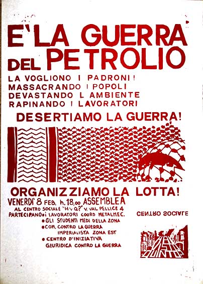 E’ la guerra del petrolio La vogliono i padroni massacrando i popoli, devastando l’ambiente, rapinando i lavoratori, desertiamo la guerra! Organizziamo la lotta! Centro Sociale “Hai visto Quinto?” Roma, 1991 numero: 0320dimensione: 100x70 cm Antimilitarismo, Catalogo Manifesti, Internazionali