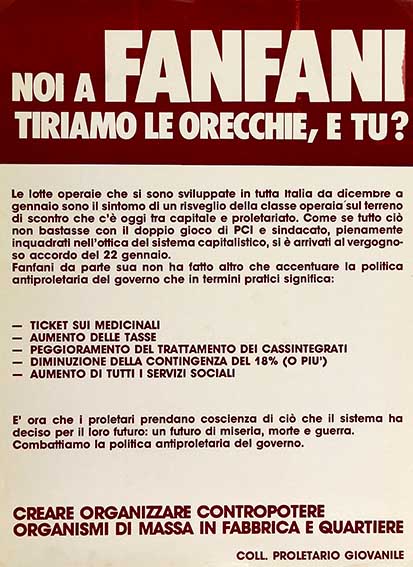 Noi a Fanfani tiriamo le orecchie e tu?, manifestoLe lotte operaie che si sono sviluppate in tutta italia da dicembre a gennaio sono il sintomo di un risveglio della classe operaia sul terreno di scontro che c’è oggi tra capitale e proletariato … Fanfani da parte sua non ha fatto altro che accentuare la politica antioperaia del governo che in termini pratici significa: ticket sui medicinali, aumento delle tasse, peggioramento del trattamento dei cassaintegrati, diminuzione della contingenza del 18% (o più), aumento di tutti i servizi sociali