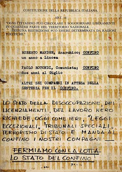 Roberto Mander, anarchico, confino un anno a Linoda; Paolo Rotondi, comunista, confino due anni al Giglio; altri sei compagni in attesa della sentenza per il confino