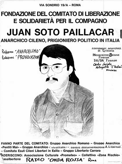 Fondazione del comitato di liberazione e solidarietà per i compagno Juan Soto Paillacar Anarchico cileno, prigioniero in Italia Gruppo anarchico Romano, Gruppo Anarchico “Pentiti Mai” … Roma numero: 3586dimensione: 94x70 cm Catalogo Manifesti, Internazionali, Lotta Armata - Carcere e Repressione, Movimento Anarchico, Radio Onda Rossa