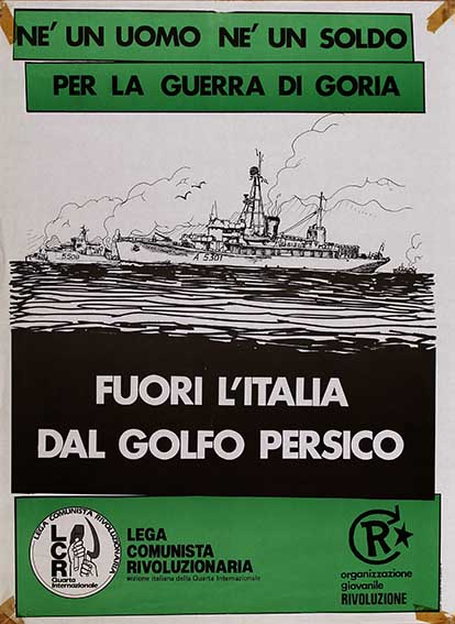 Fuori l’italia dal golfo Persico Né un uomo né un soldo per la guerra di Goria Lega Comunista Rivoluzionaria -sezione italiana della Quarta Internazionale, Organizzazione giovanile Rivoluzione 1987 numero: 1562dimensione: 79x58 cm Antimilitarismo, Catalogo Manifesti, Movimento Antagonista