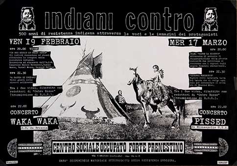 Indiani contro 500 anni di resistenza indigena attraverso le voci e le immagini dei protagonisti 19 Febbraio – 17 Marzo concerti Centro Sociale Occupato Forte Prenestino Roma numero: 1124dimensione: 50x70 cm Catalogo Manifesti, Centri sociali, laboratori e spazi occupati