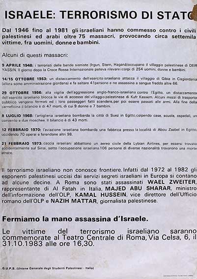 Il terrorismo israeliano non conosce frontiere . Infatti dal 1972 al 1982 gli esponenti palestinesi uccisi dai servizi segreti israeliani in Europa si contano ad alcune decine