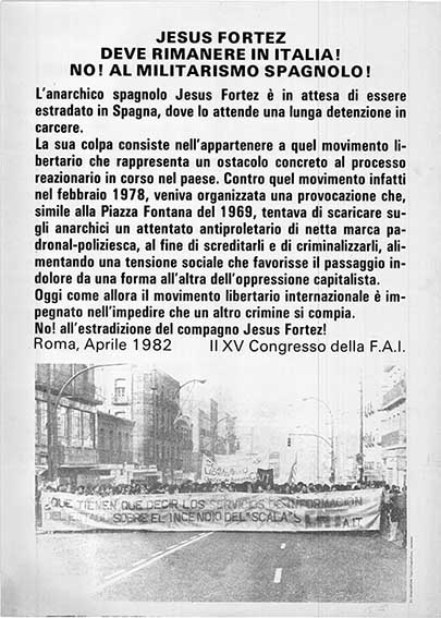 Jesusu Fortez deve rimanere in Italia, manifestoL’anarchico spagnolo Jesus Fortez è in attesa di essere estradato in Spagna, dove lo attende una lunga detenzione in carcere. La sua colpa consiste nell’appartenere a quel movimento libertario che rappresenta un ostacolo concreto al processo reazionario in corso nel paese. Contro quel movimento infatti nel febbraio 1978, veniva organizzata una provocazione che, simile a Piazza Fontana del 1969, tentava di scaricare sugli anarchici un attentato antiproletario di netta marca padronal-poliziesca, al fine di screditarli e di criminalizzarli, alimentando una tensione sociale che favorisse il passaggio indolore da una forma all’altra dell’oppressione capitalista