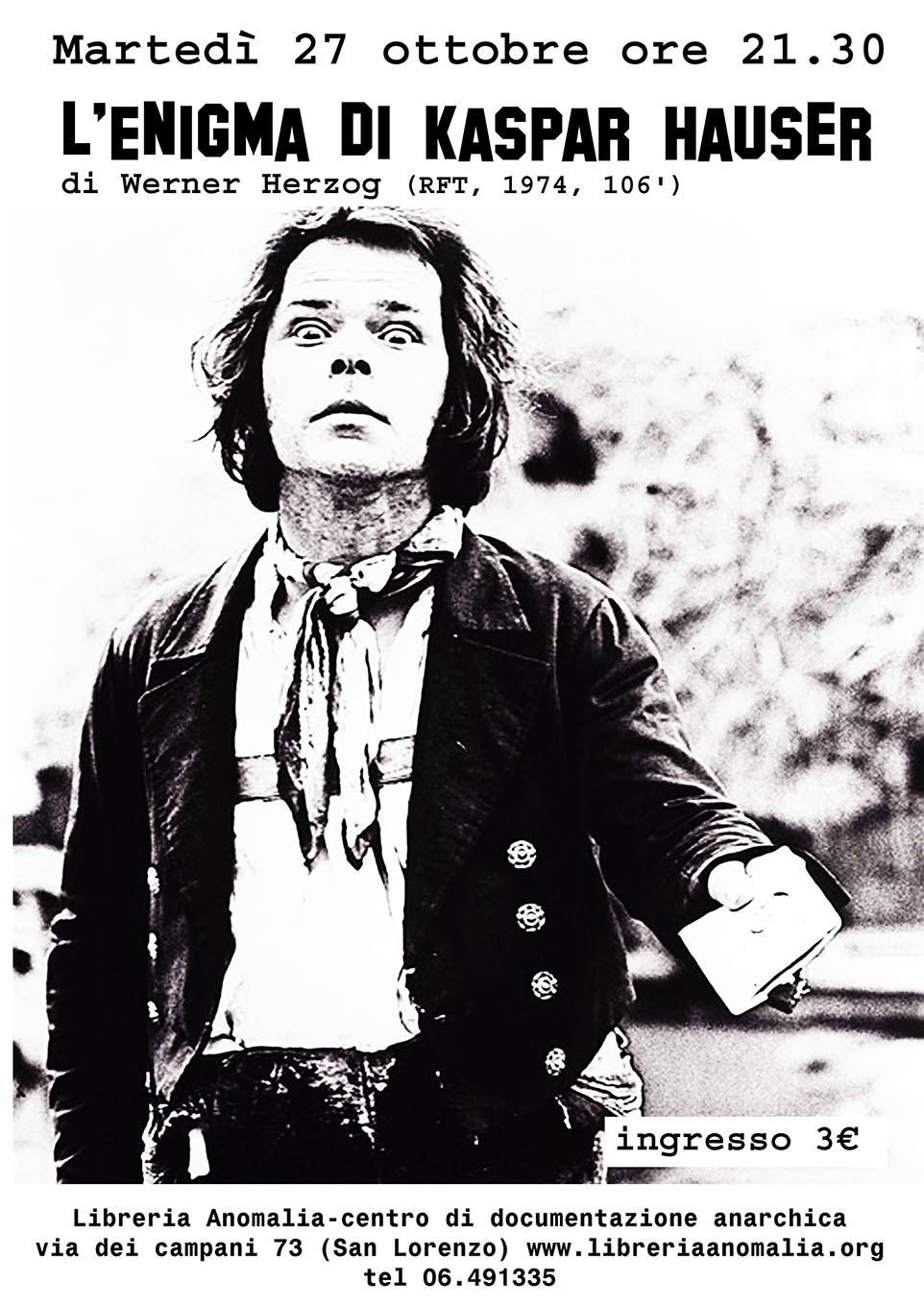 Un giovane viene trovato nella piazza di Norimberga (citata nell’introduzione del film come N.) con una lettera in mano. Egli non sa parlare, se non ripetere un’unica frase che gli è stata insegnata a forza. L’unica cosa che è in grado di scrivere è la sua firma, Kaspar Hauser. Il giovane, essendo stato rinchiuso in una cella sin dalla nascita, non ha mai visto un essere umano in vita sua, cammina a stento e non è nemmeno in grado di stare seduto a tavola.