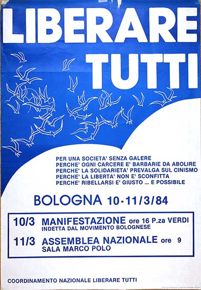 Liberare tutti Per una società senza galere … Manifestazione assemblea 10/11 Marzo Coordinamento nazionale liberare tutti Bologna, 1984 numero: 0140dimensione: 100x70 Catalogo Manifesti, Lotta Armata - Carcere e Repressione