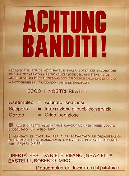libertà per pifano, bastelli, miro manifestoAchtung banditi! I baroni del Policlinico, battuti dalla lotta dei lavoratori che ha strappato la regionalizzazione dell’assistenza …