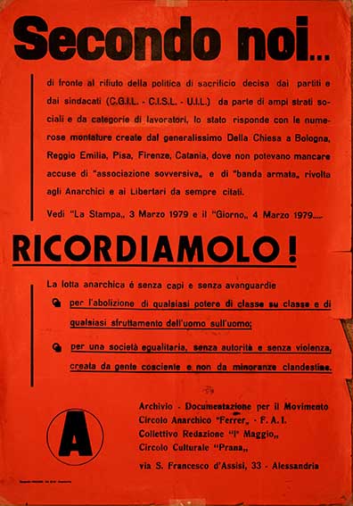Secondo noi di fronte al rifiuto della politica di sacrificio deciso dai partiti e dai sindacati (C.G.I.L. – C.I.S.L. – U.I.L.) da parte di ampi strati sociali e da categorie di lavoratori, lo stato risponde con le numerose montature create dal generalissimo Della Chiesa a Bologna, Reggio Emilia …