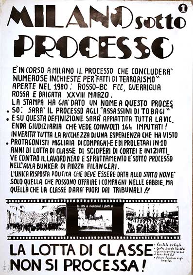 Milano sotto processo, manifestoE’ in corso a Milano il processo che concluderà numerose inchieste per “fatti di terrorismo” aperte nel 1980: Rosso-BC FCC, Guerriglia Rossa e Brigata XXVII Marzo