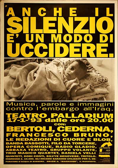 Musica, parole e immagini contro l’embargo all’Iraq Anche il silenzio è un modo di uccidere Teatro Palladium 17/1/’93, la redazione di Cuore e Blob Un Ponte per Baghdad Roma, 1993 numero: 0297dimensione: 100x70 cm Catalogo Manifesti, Internazionali