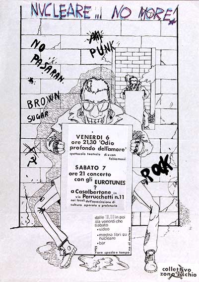 Nucleare no more Spettacolo teatrale, concerto Collettivo zona a rischio Roma, 1987 numero: 1574dimensione: 70x50 cm Ambiente-Antinucleare, Catalogo Manifesti, Centri sociali, laboratori e spazi occupati