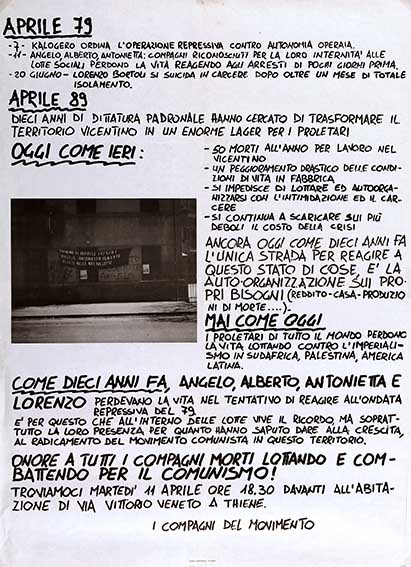 onore a tutti i compagni morti lottando … … e combattendo per il comunismo! Mobilitazione per ricordare Angelo, Alberto, Antonietta e Lorenzo. I compagni del movimento Thiene, 1989 numero: 0988dimensione: 88x64cm Catalogo Manifesti, Lotta Armata - Carcere e Repressione, Movimento Antagonista