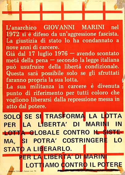 per la libertà di marini L’anarchico Giovanni Marini nel 1972 si è difeso da un’aggressione fascista … Per la libertà di Marini lottiamo contro il potere. Il Seme Carrara, 1976 numero: 0723dimensione: 84x60cm Catalogo Manifesti, Lotta Armata - Carcere e Repressione, Movimento Antagonista