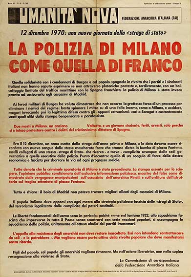 la polizia di milano come quella di franco Prima pagina di Umanità Nova. 12 dicembre 1970: una nuova giornata della “strage di stato” … La Commissione di corrispondenza della F.A.I. Roma, 1970 numero: 0709dimensione: 86x60cm Catalogo Manifesti, Lotta Armata - Carcere e Repressione, Movimento Anarchico