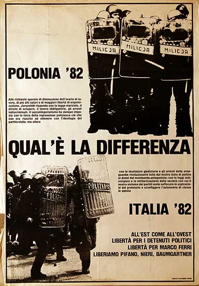 Polonia ’82 Italia ’82 qual’è la differenze All’est come all’ovest libertà per i detenuti politici Libertà per Marco Ferri, liberiamo Pifano, Nieri, Baumgartner Comitati Autonomi Operai 1982 numero: 0115dimensione: 100x70 Catalogo Manifesti, Internazionali, Lotta Armata - Carcere e Repressione