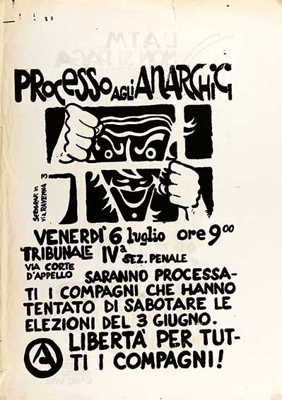 processo agli anarchici Venerdì 6 luglio … saranno processati i compagni che hanno tentato di sabotare le elezioni del 3 giugno … Libertà per tutti i compagni! [Vari] Torino numero: 0685dimensione: 84x60cm Catalogo Manifesti, Lotta Armata - Carcere e Repressione, Movimento Anarchico