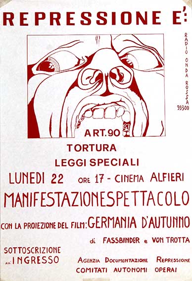 Repressione è … … art. 90, tortura, leggi speciali Lunedì 22 manifestazione spettacolo Agenzia Documentazione Repressione, Comitati Autonomi Operai Roma, 1983 numero: 1403dimensione: 64x44 cm Catalogo Manifesti, Lotta Armata - Carcere e Repressione, Radio Onda Rossa
