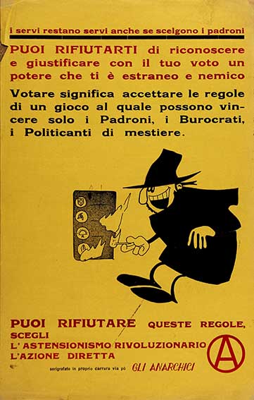 scegli l’astensionismo rivoluzionario I servi restano servi anche se scelgono i padroni. Puoi rifiutare queste regole. Scegli l’astensionismo rivoluzionario e l’azione diretta. Gli anarchici Carrara numero: 2149dimensione: 70x45cm Astensionismo, Catalogo Manifesti, Movimento Anarchico
