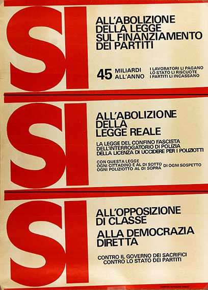 sì all’abolizione della legge sul finanziamento dei partiti Sì all’abolizione della legge Reale, sì all’opposizione di classe, alla democrazia diretta. Comitati autonomi operai 1978 numero: 0887dimensione: 88x64cm Catalogo Manifesti, Movimento Antagonista