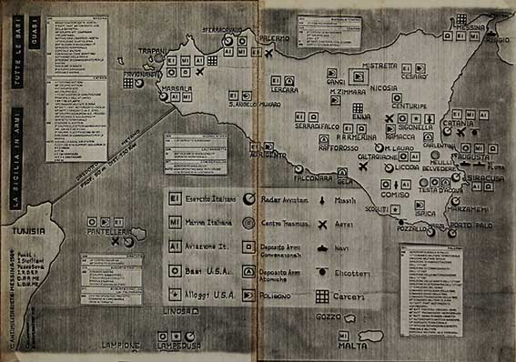 La Sicilia in armi Tutte le basi o quasi Comitato Antimilitarista Messina Messina, 1984 numero: 1411dimensione: 42x60 cm Antimilitarismo, Catalogo Manifesti